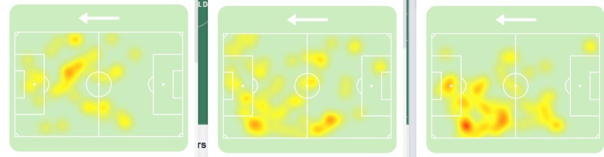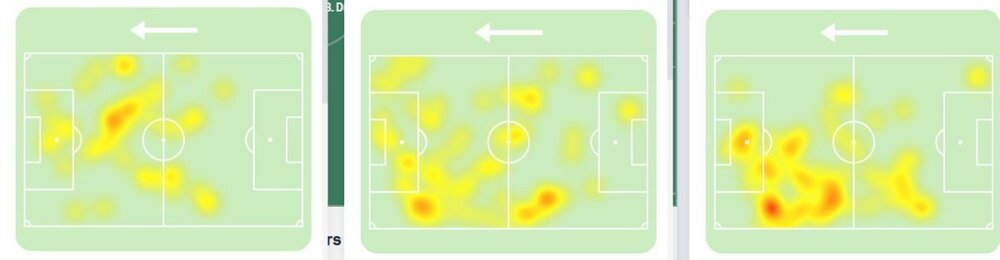 Na donjem snimku su radijusi kretanja tri igrača, Kataia, Ivanića i Duartea. Lako će se utvrditi ko je ko. Dvojici se skoro preklapaju radijusi, a treći koji je nominalno centarfor je više vremena proveo bliže centru nego šesnaestercu. I onda je Duarte kriv što ne daje golove.