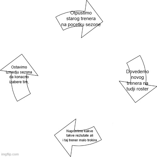 Ove sezone smanjimo očekivanja i oprostimo mu sve greške jer nije birao roster. Onda lepo na leto odabere koga želi, sastavi svoj tim, počne sezona, ubrzo zaređamo tri poraza, ne ličimo ni na šta i šutnemo ga u novembru-decembru. Bio je čak jedan slučaj (Radonja) kad se ovo nije desilo. Kod svih ostalih u poslednjih 6-7god jeste nešto slično. Tomić, Obradović, Vlada Jo, Duškista, Janis - svi odleteli pre NG.