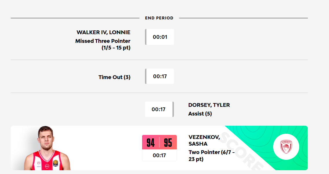 Zadnjih 5 napada. Posle trojke za 93:81, u sledećem napadu su imali dobru akciju gde je Briset promašio otvorenu trojku, a nakon toga su im se napadi svodili na čekanje da prođe vreme i šuteve za tri pred kraj napada (tri puta Voker, jednom Dovntin) uz ono Brisetovo zaletanje u Vezenkova.