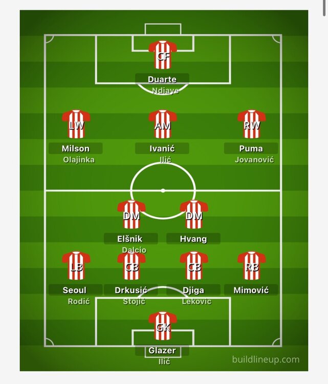 Najjradije bih voleo da dovedemo levog beka, ali s obzirom da se to neće desiti, probao bih da se Seol adaptira levo (ne mogu više da gledam Rodića) i Mimovic nek igra desno, ima pomoć i Pume na toj strani koji je solidno defanzivno odgovoran. Takođe, s obzirom da se Spajića nećemo rešiti sigurno, nek prodaju Lekovića. Đigu obavezno zadržati i on i Drkušić odličan stoperski tandem, jaki na lopti. U napadu definitivno prva opcija da bude Duarte koji je tehnicki mnogo jači igrač od Ndiayea, uz to može i da se izvlači desno i dodatno otvara prostor Pumi koji ulazi u sredinu.