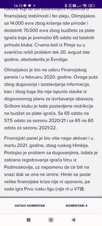 Evo ti objasni zasto Evroliga nije izdala konkretno zasta se klub kaznjava iako je nakon ispkcije bilo naloženo da se dugovi izmore. Sto je uradjeno. I mesto ocekivane finansijske kazne koja je realna opcija za tako nesto ti klub kaznjavas da registruje top igrača i da dovede legitimnog evroligaskog igrača. Ako je to u intersu sporta onda sam ja Cezar lično.