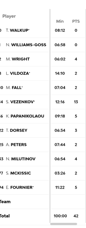 Bitno da je svih 12 igraca igralo 3+ min u Olimpijakosu. Bukvalno su poveli 10-ak razlike i onda krenuo Barcokas da tumba preterano... Stavise 11/12 igraca je igralo 6+ minuta.
