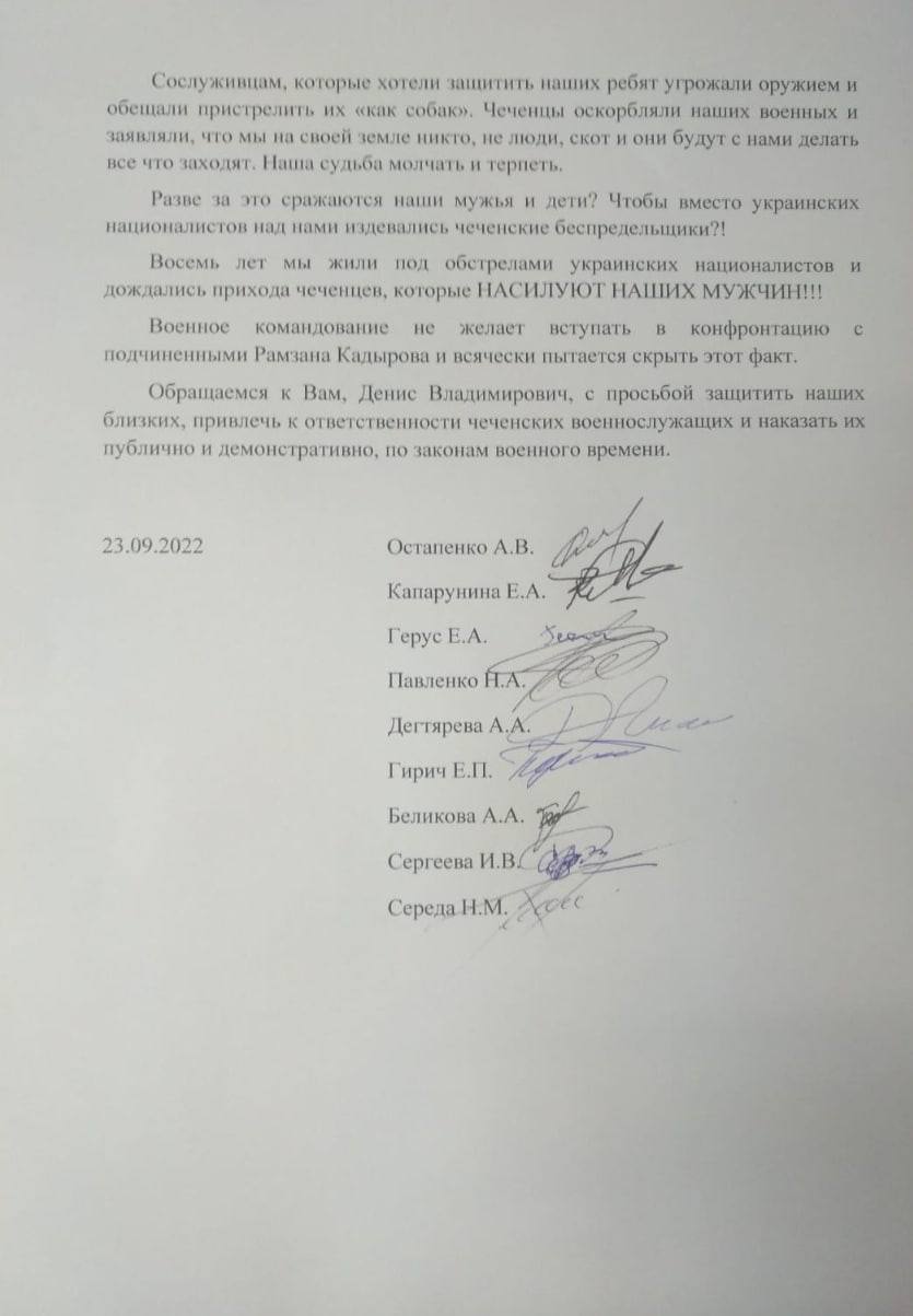 We, the undersigned wives and mothers of servicemen of the 1st Army Corps of the Donetsk People's Militia, who were mobilised from Dokuchayevsk ask you to intervene in the situation and  to protect our husbands and sons from the harassment of the military personnel of the Chechen Republic, to conduct an investigation and punish those responsible who mocked us by our relatives.