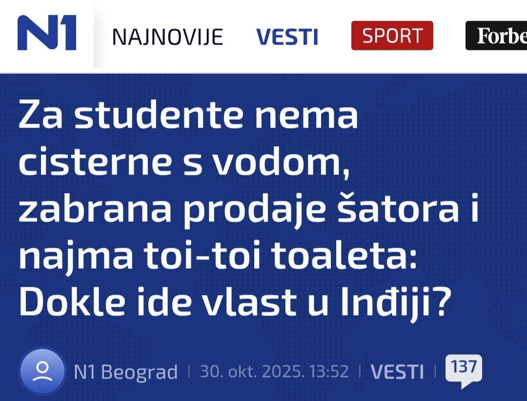 Volter Posted 3 hours ago Posted 3 hours ago Quote Pripadnici intervetne jedinice policije, u punoj opremi za razbijanje demonstracija, intervenisali su u Ulici kneza Miloša kod Skupštine Srbije gde je Dijana Hrka danas u 11.52 započela štrajk glađu. Policija je sa kolovoza potisnula građane koji su došli da pruže podršku Hrki, uhapsila je auto-prevoznika Milomira Jaćimovića i zaplenila autobus kojim je on prevozio niške studente sa komemorativnog skupa u Novom Sadu. Kako su za N1 rekli studenti koji su došli da podrže Dijanu Hrku i trenutno se nalaze u centru Beograda, u autobusu je ostalo troje njihovih kolega - Milan, David i Irina - koji su, kako navode, "kidnapovani od strane policije" koja je odvezla Jaćimovićev autobus. "Našim kolegama nije dozvoljeno da napuste autobus, a vozilo je odvezeno u Beogradsku vatrogasnu brigadu kod Bogoslovije", kazali su oni za N1. 1