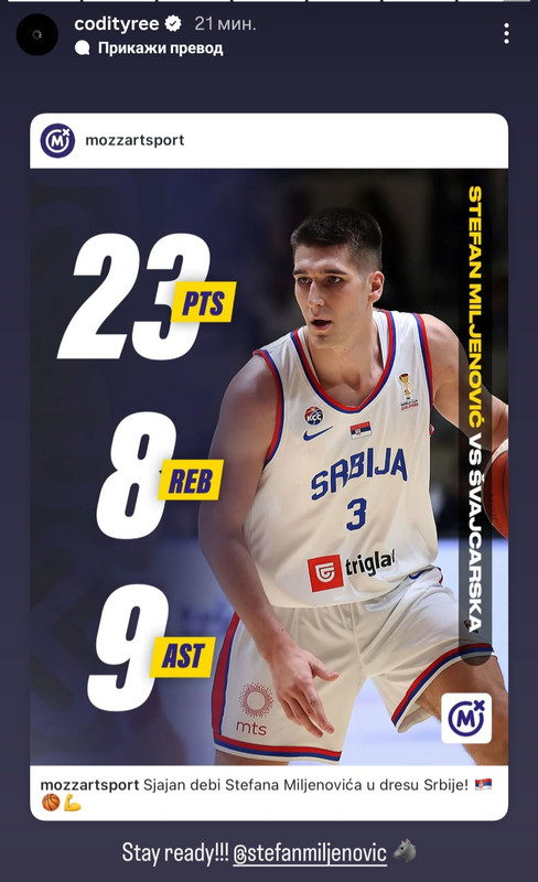 Kooineeperk Posted 1 hour ago Posted 1 hour ago 1 hour ago, VISOKOLETAC said: Miljenovic za sada 18pts 8 skok i 8 asis. Imamo, a ne znamo da imamo 🙂 48 minutes ago, VISOKOLETAC said: Na kraju 23 poen 8 skokova i 9 asistencija. Bravo za Miljenovica. Taman za KRK i KLS, jer Svajcarska je taj neki nivo (pre polufinalnih i finalnih utakmica). Salim se, odlican je bio, meni je on odlican domaci, zahvalan igrac, jak, moze i sut ali pre svega ide ulaz, a tranzicija tek. 2