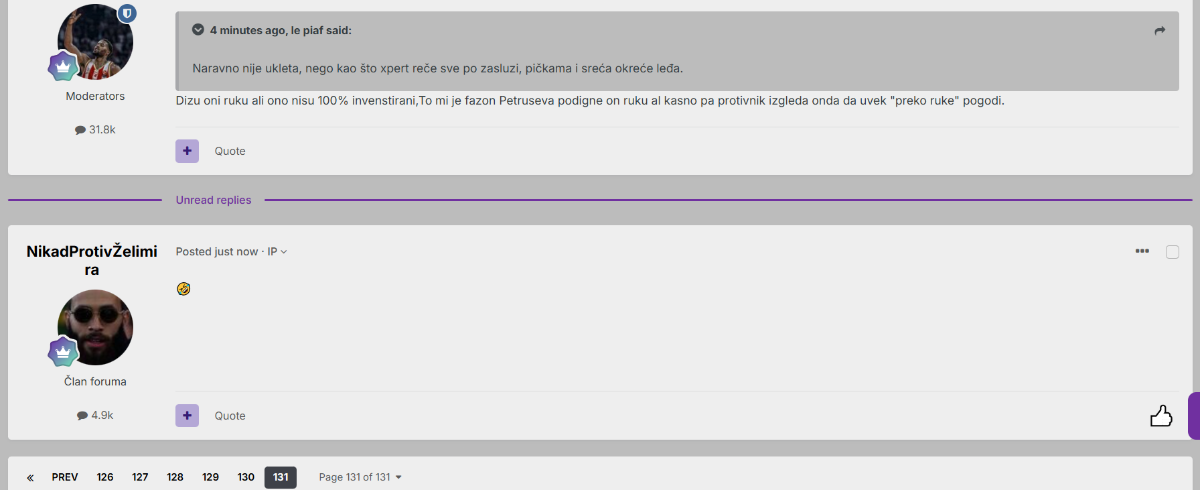 Xpert Posted 4 hours ago Posted 4 hours ago 1 minute ago, realno *w said: 5. trojka preko ruke za četvrtinu i po. I onda mi neko kaže da ova ekipa nije ukleta. Nije uklet, vec dobija ono sto zasluzuje. Cak i kad nesto promase, uhvate ofanzivni skok. 4 promasena bacanja... Uz to imamo igraca koji igra 1 na 5. Karma je gadna stvar. 1
