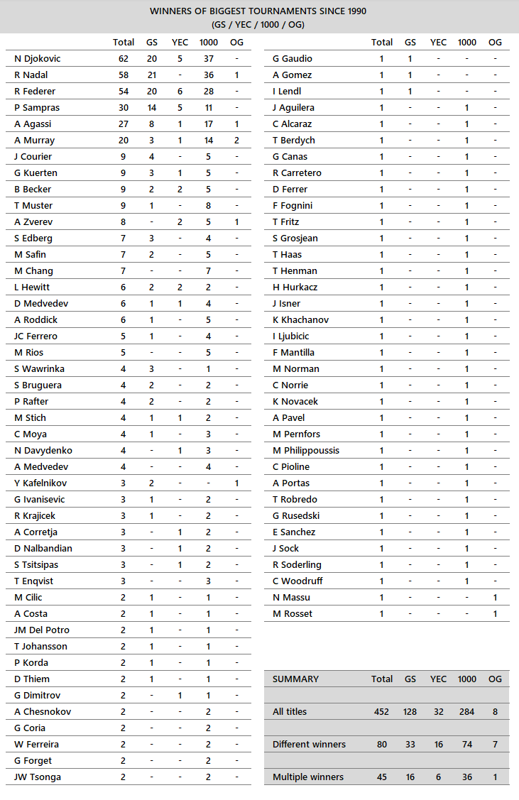 wwww Posted April 18, 2022 Author Posted April 18, 2022 All winners and finalists of tournaments above ATP 500 level since 1990* (* that's when Masters 1000 Series was de facto established)